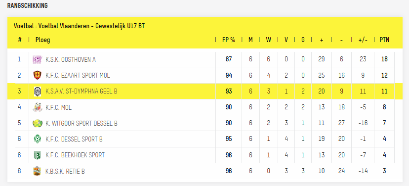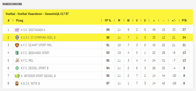 | za 13-09-2025 | 11:15 | K. Witgoor Sport Dessel B Niv.1 - K.S.A.V. St-Dymphna Geel B Niv.2-1 | 0-9 |